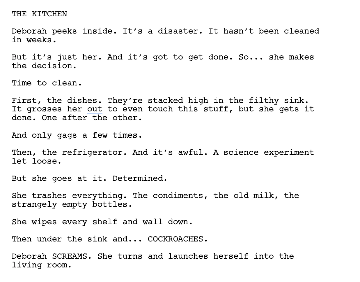 Let's make it a comedy, and Deborah is wholly unprepared to clean anything. She is spoiled and easily grossed out.