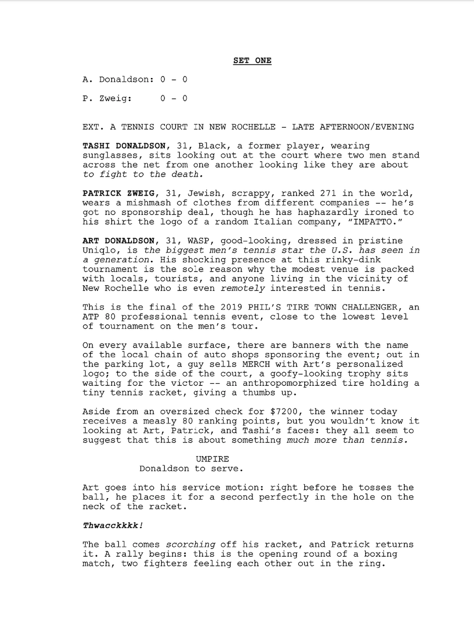 The first page of CHALLENGERS actually got some attention among screenwriters last fall. The first page is dense. It is full of details, atmosphere, and the emotions of the moment. It is a well-written screenplay.