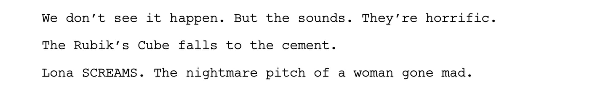 I do something similar with Lona’s scream. Trying describe such a thing is a bigger task than I may be up for. So I just focus on the results and hopefully evoke the absolute nightmare of this moment.